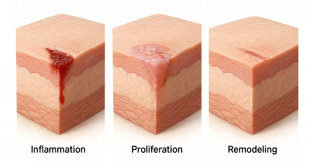 เมื่อเกิดแผล ร่างกายจะมีกลไกซ่อมแซมและฟื้นฟูผิวตามธรรมชาติ โดยแบ่งออกเป็น 3 ระยะหลัก ดังนี้: