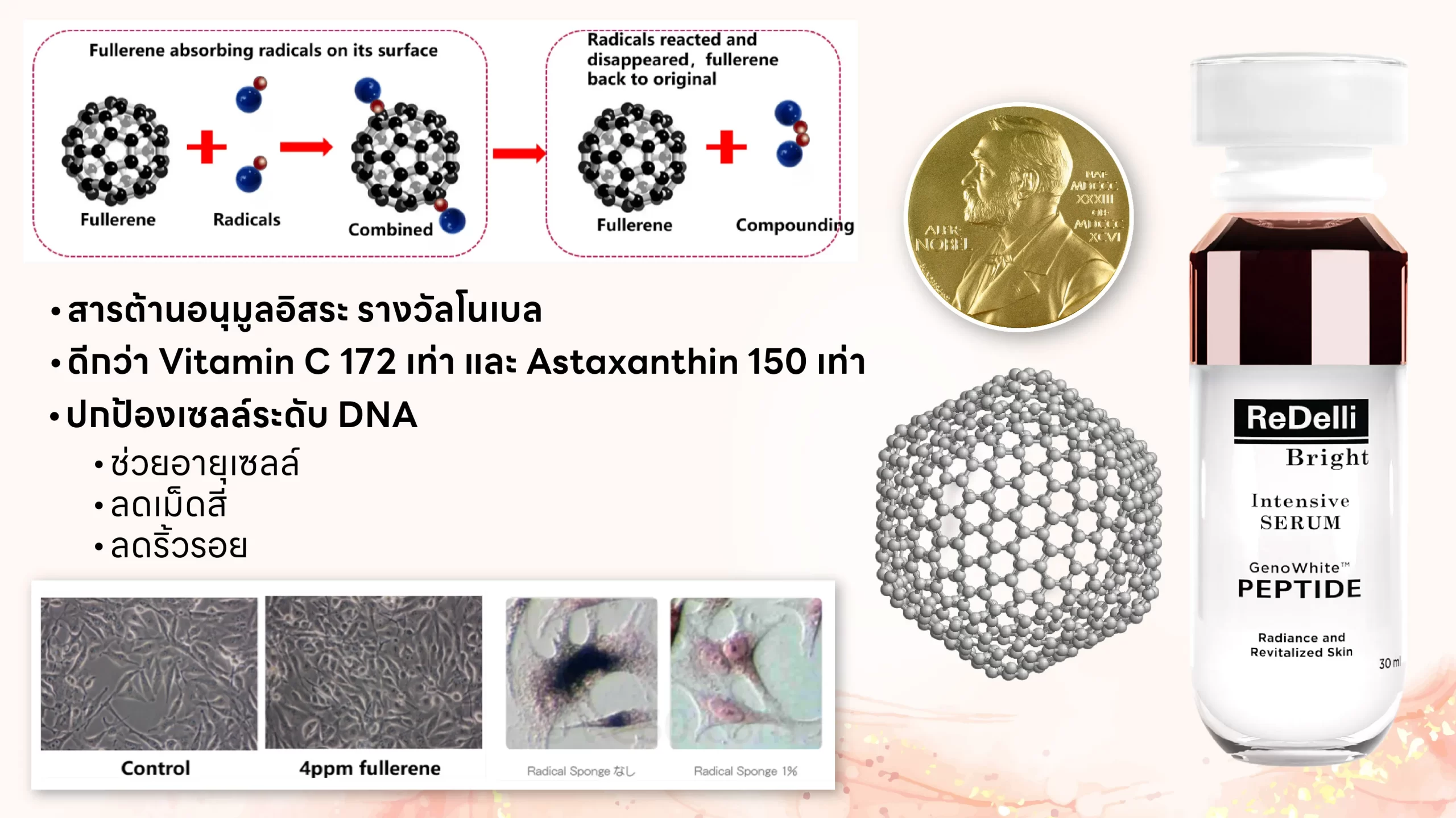 Fullerene ทำหน้าที่เหมือน “ฟองน้ำ” ที่เสถียร จับอนุมูลอิสระที่ทำร้ายผิว ทำงานซ้ำได้อย่างต่อเนื่อง โดยไม่สลายตัวเอง ต่างจากวิตามิน C ที่ทำงานครั้งเดียวแล้วเสื่อมไป