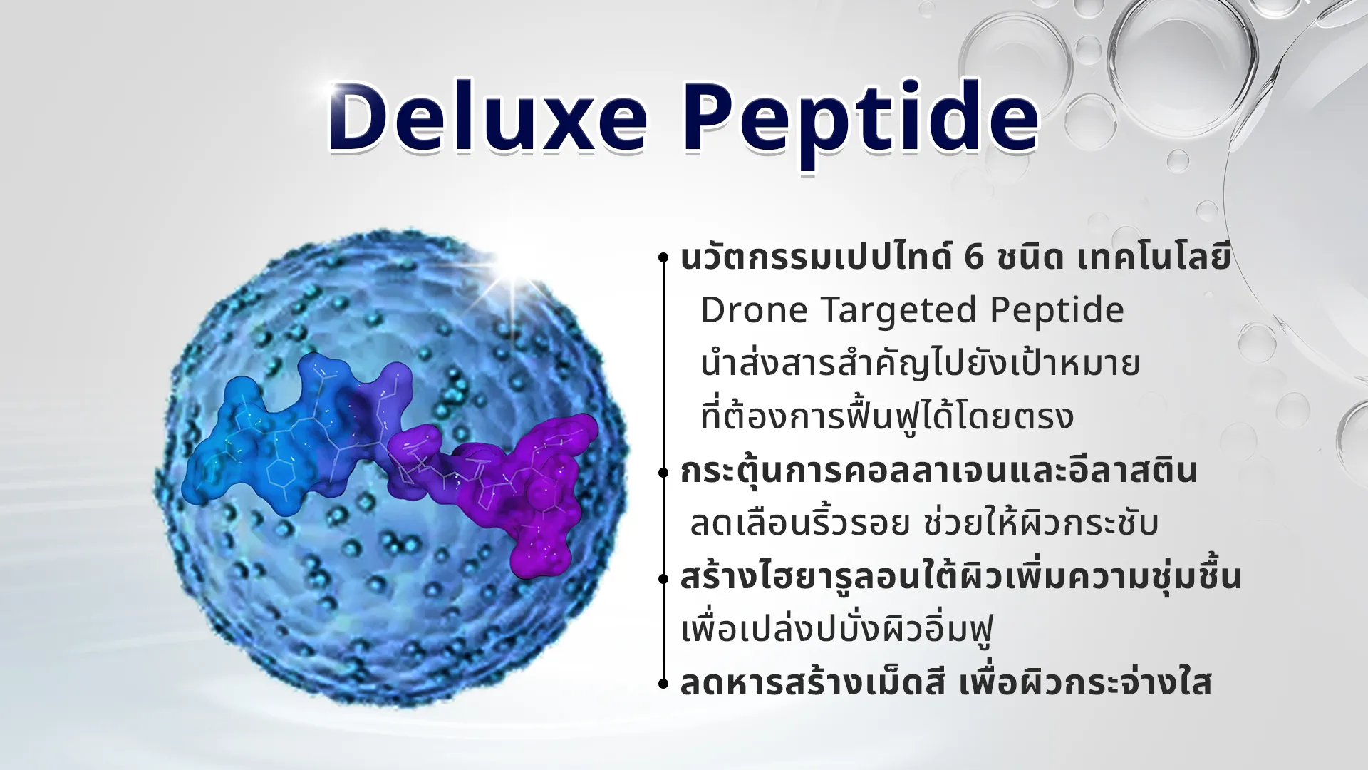 - Deluxe Multi-Peptide 6 ชนิด กับ Drone Targeted Techonology ทำงานลึก ส่งสารออกฤทธิ์ไปยังจุดที่ผิวต้องการฟื้นฟูโดยเฉพาะ